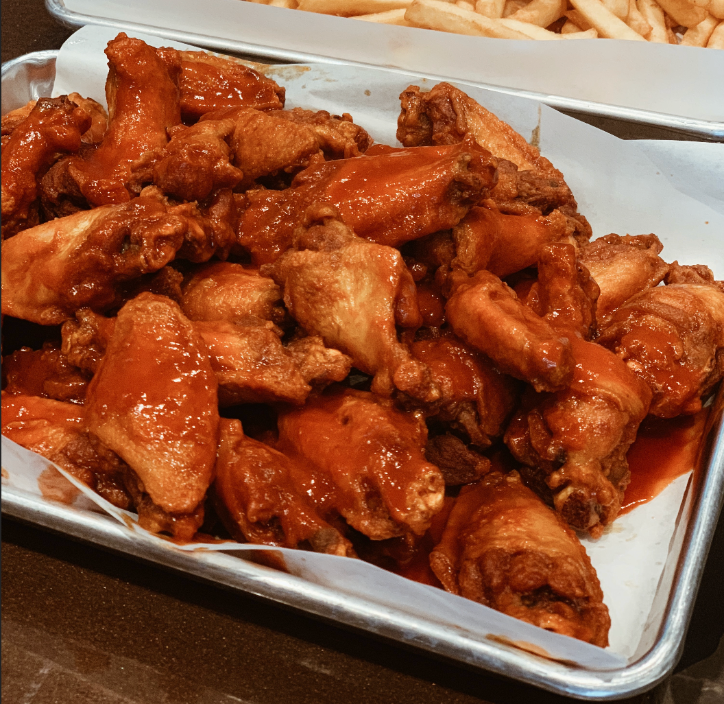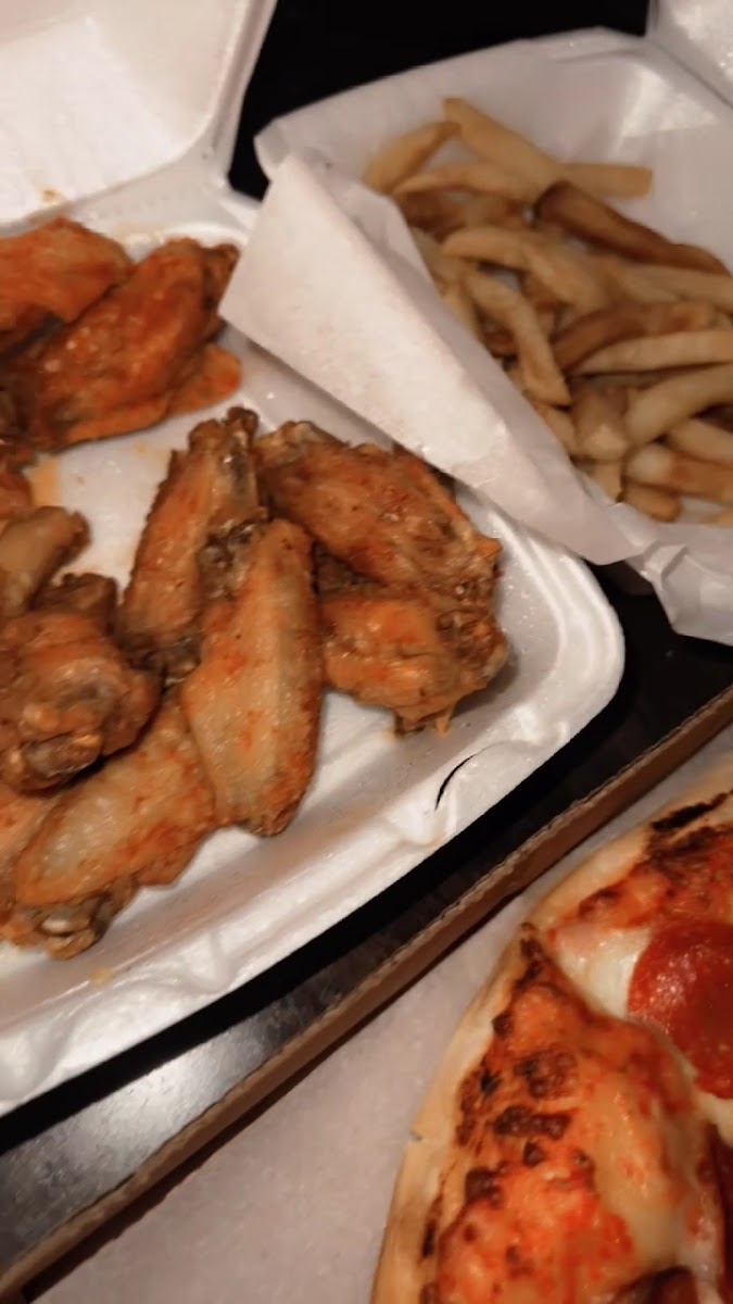 This is my first time here. Our group had a meat lovers pizza with jalapeños and olives. We also had some wings. It was all delicious.
